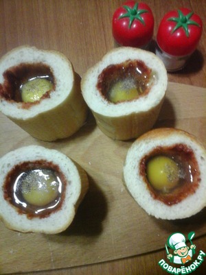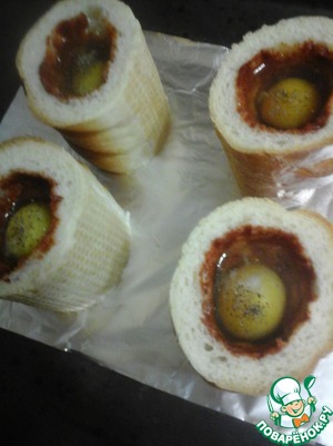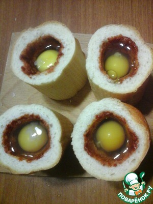 Нарезать багет. Отрезать на каждую порцию цилиндрический кусочек длиной 7-8 сантиметров (в зависимости от величины яиц).