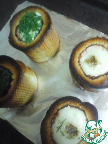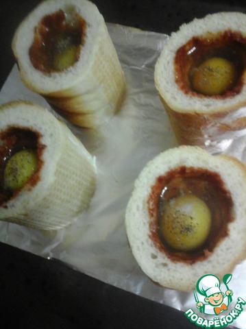 Поставить "стаканчики" на противень, устланный фольгой, и отправить в разогретую до 150-170*С духовку. Разогревать духовку сильнее не нужно, а то багет сгорит быстрее, чем приготовится яйцо. Багет должен получиться хрустящим и рассыпчатым, как тост. Держим противень в духовке до приготовления яиц - минут 10-15. Яйца лучше оставить слегка жидковатыми - так красивее и вкуснее))) Но если хотите, можно запечь и до полной готовности яиц.