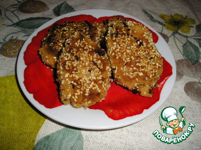 Руками формировала лепёшечки, обваливала в кунжуте и обжаривала с двух сторон на сковороде. Огонь делала умеренный и накрывала крышкой.