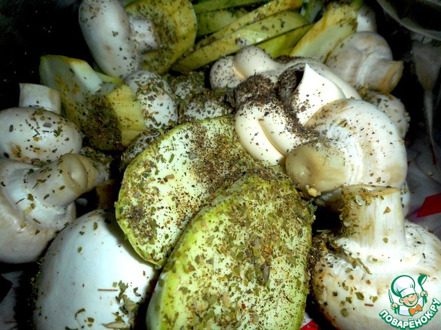 Овощи и грибы складываем в пакет, добавляем чеснок, молотый черный перец, специи и майонез или мацони.