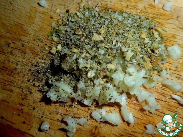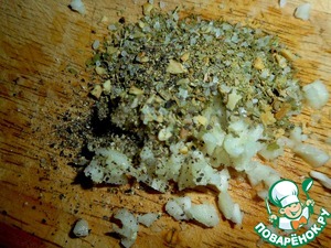 Чеснок измельчаем, перец мелем и добавляем специи.