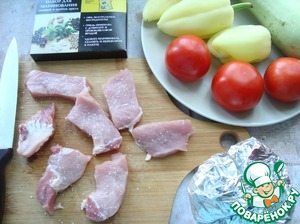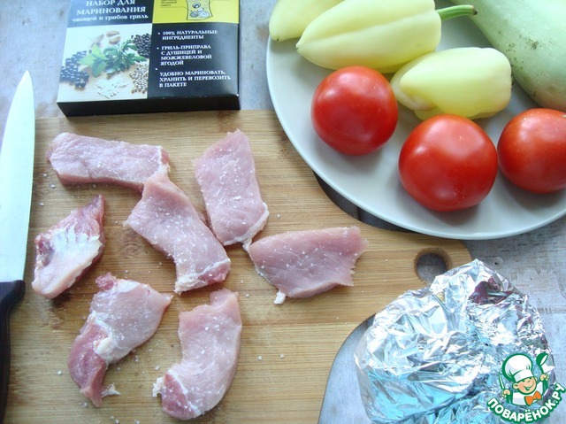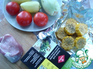 Мясо режем кусками примерно 2,5 х 4 см и чуть присыпаем солью, больше ничем. Кукурузу заворачиваем в фольгу хорошо.