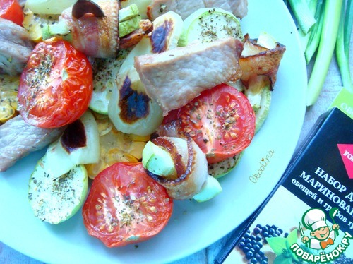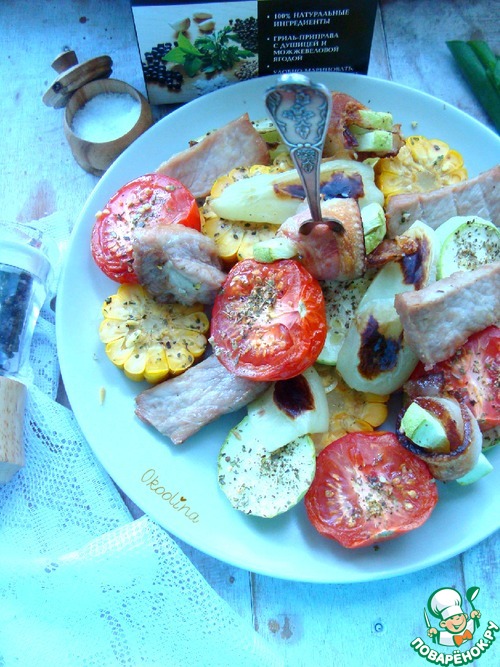 Салат из запечённых овощей: перец, помидор, кабачок, кукуруза, присыпанных приправой FORESTER для овощей, с мясом, запечённым на решётке. Хорошо сюда обернуть копчённым салом спаржу, но её не смогла сегодня купить и поэтому порезала брусочками кабачок и его завернула в сало. Это наше любимое блюдо семьи, которое часто готовим, делается оно очень быстро. Можно это блюдо сделать на мангале и дома-в духовке на гриле.