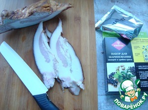 Сало режем тонко и длинными полосками, чтобы удобно было завернуть овощи, которые вы будите обёртывать. Можно воспользоваться готовой нарезкой бекона.