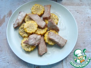 Готовим всё для салата. Кукурузу можно немного отварить, чтобы побыстрее сделать, ещё её продают уже отваренную в вакуумной упаковке. Вот такой я и воспользовалась сегодня. Порезала кусочками примерно 1,5-2 см шириной. Выложила на фольгу и присыпала приправой. Скоро уж появится молоденькая. Мясо я взяла свиную вырезку, лучше будет телятина.
