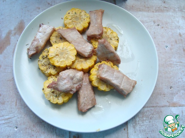 Выкладываем на решётку мясо и кукурузу, ставим в духовку-гриль. Если будите делать на мангале, то лучше всего мясо пожарить на сковороде-гриль. Мясо нужно жарить, чтобы внутри оно оставалось сочным. Кукурузу в фольге нужно закопать в угли потухшие.