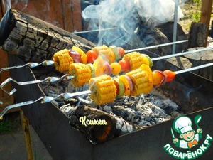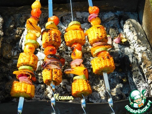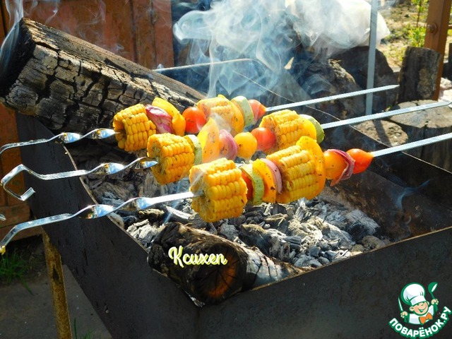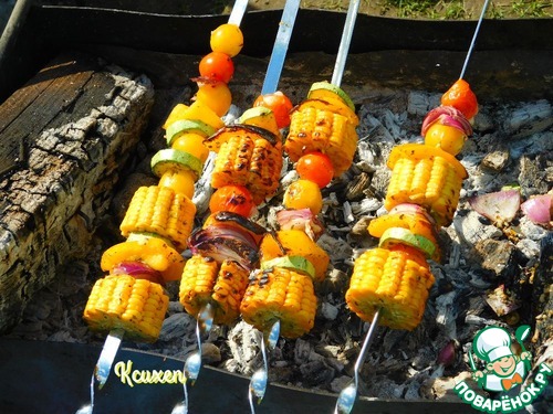 • Нанизываем овощи на шампуры в произвольном порядке. Готовим овощное ассорти над углями, периодически поворачивая шампуры, до готовности овощей.