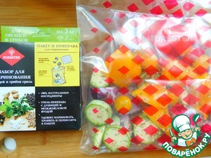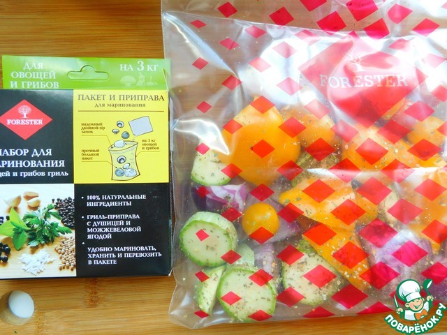 В пакет для маринования Forester положим овощи, добавим туда же гриль-приправу и оливковое масло. Закроем застёжку ZIP и потрясём пакет что бы маринад равномерно распределился.