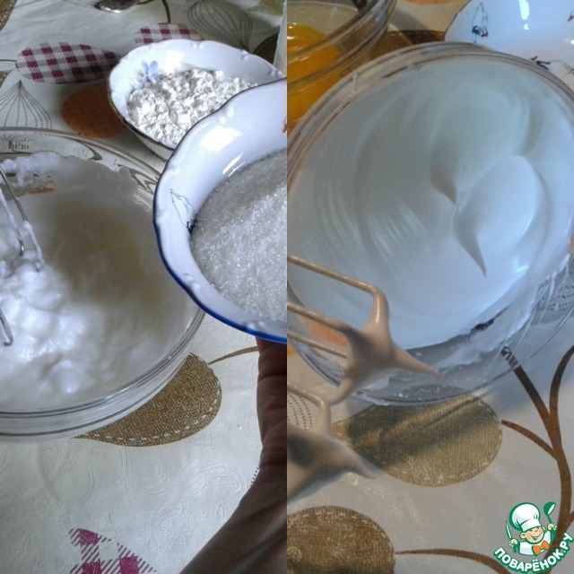 Отделить белки от желтков. Здесь надо быть очень аккуратными, чтобы в белки не попал желток. А если и попал, то не отчаивайтесь. Как я недавно прочитала статью на нашем " Поваренке", что в таком случае в белки можно добавить немного лимонного сока и все будет 👍.