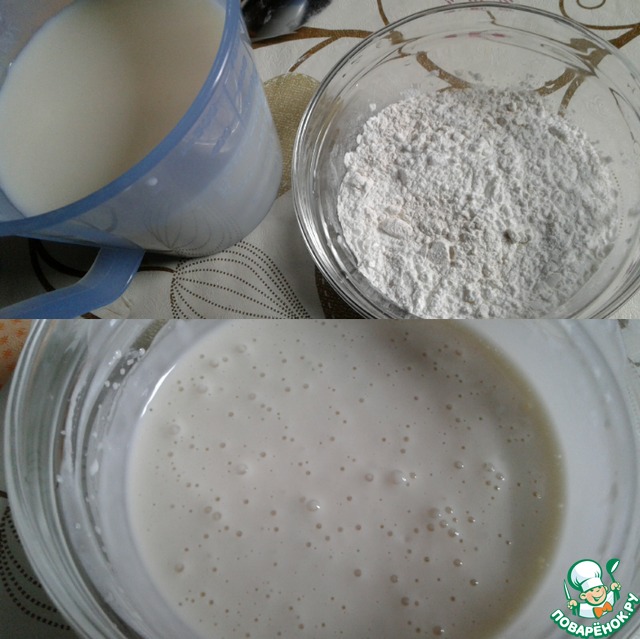 В оставшемся молоке растворяем фруктозу, затем вливаем мучную смесь, хорошо все перемешиваем и ставим на огонь.