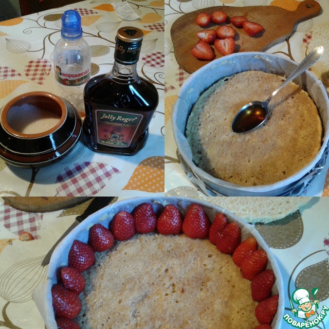 Выложили тесто в форму и ставим его в заранее разогретую духовку, выпекаем при 200°- 15 -20 минут, до сухой палочки. Пока наш бисквит выпекается займемся клубникой: помоем ее и высушим на салфетке или бумажном полотенце.