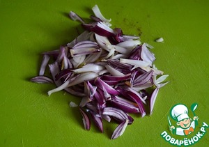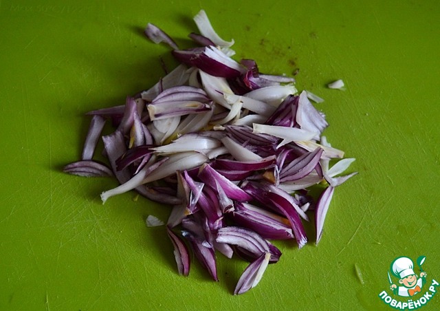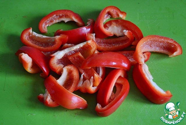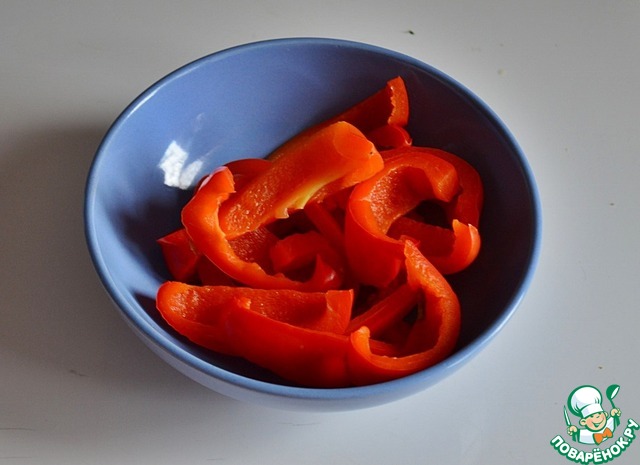 Сладкий перец очистить от семян и плодоножки, порезать полосками.