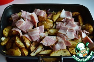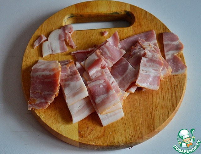 Бекон порезать довольно крупно. Можно оставить большими полосками.
