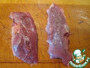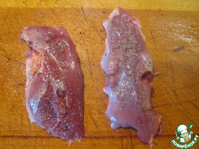 Очистить утиные грудки от кожи, слегка отбить, посолить, поперчить.