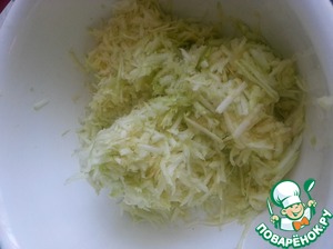 Натереть кабачки на крупной терке, добавить 1 ч. л. соли и оставить на 20 минут, чтобы дали сок.