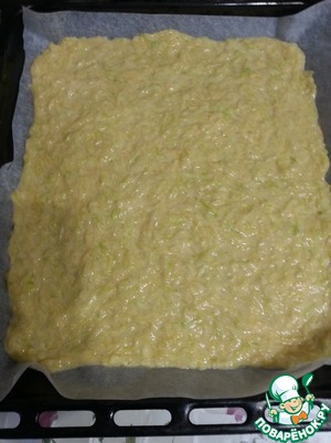 Противень (у меня 30х33 см) застелить пекарской бумагой, смазать её растительным маслом, распределить тесто по противню. -
