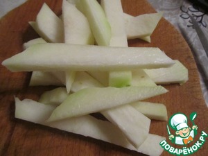 Капусту кольраби очистить от листьев и кожуры. Нарезать брусочками.