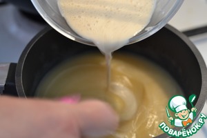 В молоке развести пудинг и, постоянно помешивая, добавить к теплому пюре.