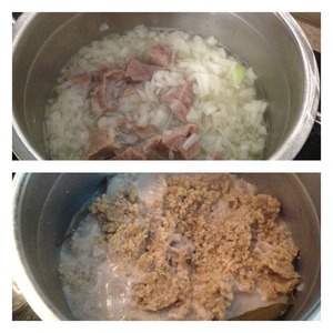 Воды в кастрюлю налить столько, чтобы только покрыть мясо с луком. Добавить соль, лавровый лист и варить на среднем огне до мягкости мяса.