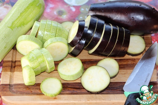 • Кабачки и баклажаны порезать шайбами толщиной не более 1 см, но не тонко. Посолить и оставить на 15 минут. Можно залить минеральной или простой подсоленной водой, тогда они при жарке на сковороде не возьмут много масла, а при жарке на гриле не высохнут.