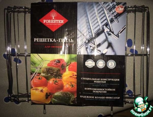 • Пока маринуются овощи, приготовим решетку для запекания овощей. Решетка тоже фирмы Forester. Решетка-гриль для овощей. Специальная конструкция этой решетки позволяет готовить на открытом огне овощи, в том числе картофель, целиком, сохраняя их полезные свойства и не деформируя их. Целиком баклажан, целиком кабачок.