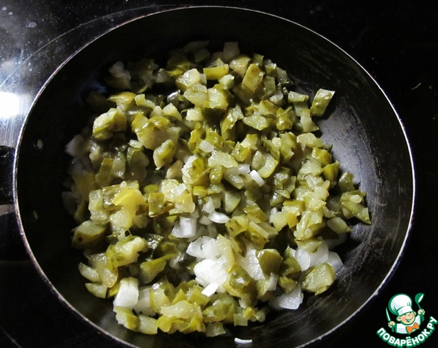 Огурцы и лук мелко нарубить и спасеровать на растительном масле.