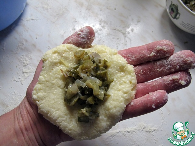 Тесто получается довольно липкое. Поэтому смазываем руки растительным маслом, берем примерно 85 гр теста, делаем лепешечку, выкладываем чайную ложку начинки и складываем в "пирожок". Не надо напрягаться сильно скреплять края,- пирожок не разваливается и начинка не вытекает.