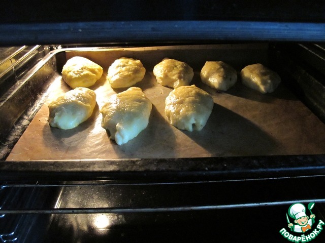Пирожки смазываем сметаной и отправляем в духовку при 180° примерно на 20 минут до зарумянивания.