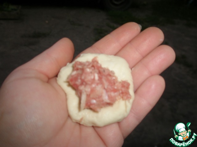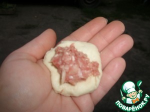 Лепим пирожок. Чайной ложкой выкладываем фарш.