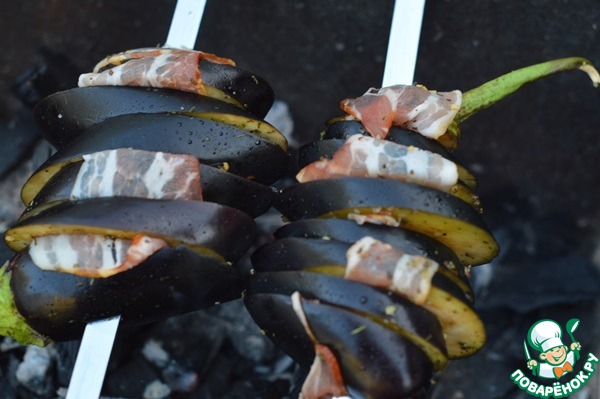 3. Затем на шампуры Forester одеть ломики баклажана, чередуя полосками бекона. Готовить на тлеющих углях до готовности.