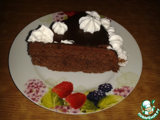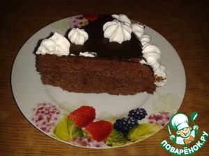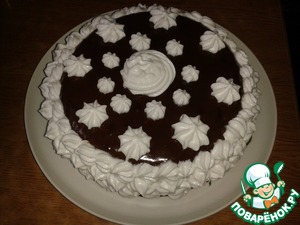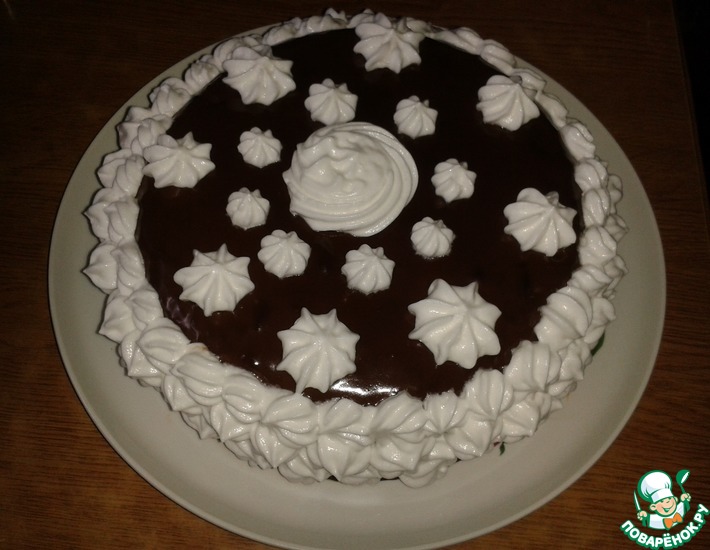 Разрезать корж на две или три части. Я использую нитку. Ну а далее уже полет фантазии. Самый проверенный для меня крем - это сметана 20%-я с сахаром, ее необходимо взбить до растворения сахара, промазать коржи, дать постоять часа два-три и готово. Возможно, что это знают многие, но все же скажу, что до промазывания кремом я делаю той-же деревянной палочкой дырки в коржах, так легче крем в них проникнет. В данном случае я использовала пропитку с абрикосовым сиропом, между коржей и поверху крем "Ганаш", украсила кремом "Мокрое безе".