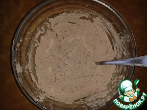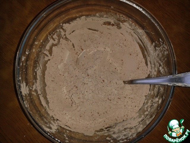 Смешать в отдельной миске крахмал, разрыхлитель, какао и добавить во взбитые яйца, аккуратно вымешивая лопаткой.