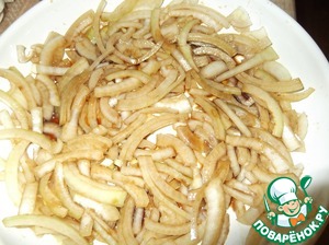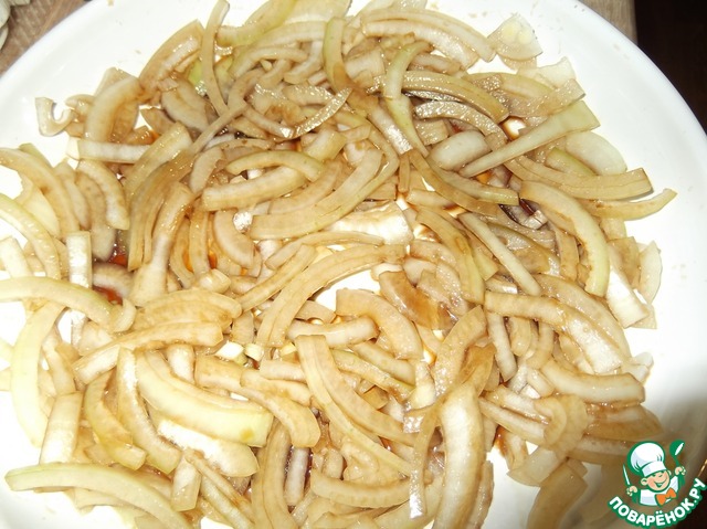 Лук нарезать полукольцами. Выложить его в блюдо в котором будет запекаться рыба. Залить лук соевым соусом и оставить его на 30 минут.
