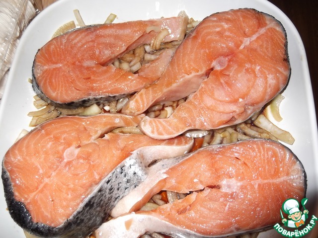 Рыбу (у меня была форель) нарезать на порционные куски. Положить рыбку на лук. По желанию рыбу можно посолить, но я не солила, так как соевый соус соленый.