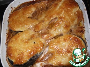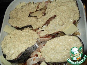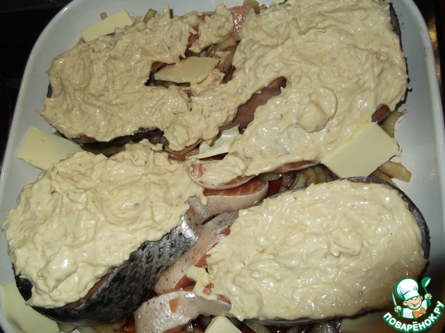 Сыр натереть на крупной терке и смешать с майонезом. Намазать этой массой сверху рыбу.