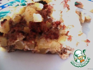 Обжарить фарш на подсолнечном масле. Мелко нарезанный лук обжарить с фаршем. Отваренный картофель нарезать кубиками и хорошо перемешать с фаршем, добавить сырые яйца, соль, перец и сново хорошо перемешать. Форму смазать маслом и посыпать сухари, затем все выложить в форму для запеканки. Запекать в хорошо нагретой духовке при 200С до золотистой корочки картофеля.