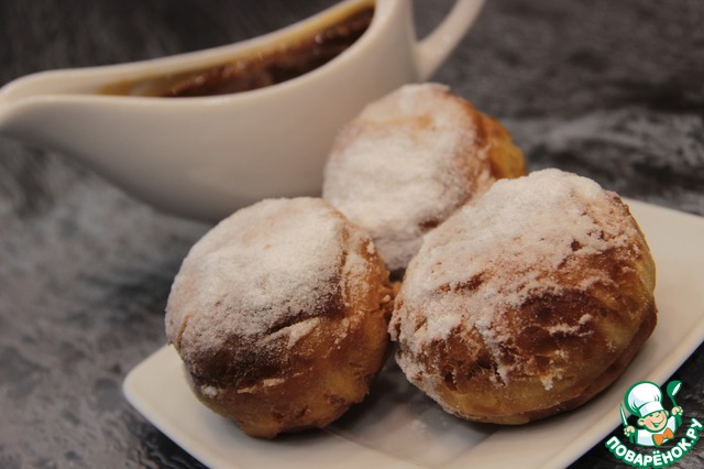Мне было некогда, поэтому я просто подала пончики с кремом - смешала 100 гр творога и 4 ст л шоколадного пудинга (готового) в блендере до гладкости.