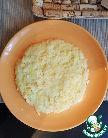 • Выкладывать салат я начинала с картофеля, также по размеру сковороды на которой обжаривается фарш. Можно сформировать слой прямо в ней и лопаткой аккуратно переложить на блюдо.