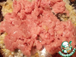 Порежем мелко лук и доведем до золотистого цвета на масле. Туда же отправим фарш и готовим его до готовности вместе с луком.