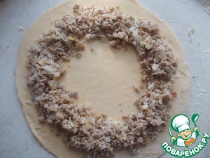После того как тесто постояло и увеличилось в два раза, разделим его на две части. Каждую тонко раскатаем. На одну из частей выкладываем начинку кольцом как на фото. Оставляем несколько ложек начинки.