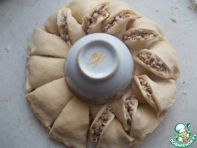 Для удобства, я кладу в серединку пиалу. Разрезаем по краю наш пирог на лепестки и разворачиваем каждый.