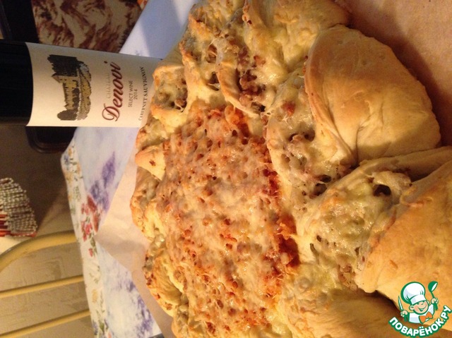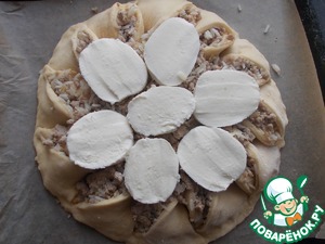 Центр пирога (начинку) сначала смазала майонезом, а за 10 минут до окончания выпекания посыпала тёртым твёрдым сыром, чтобы расплавился, но не затвердел.