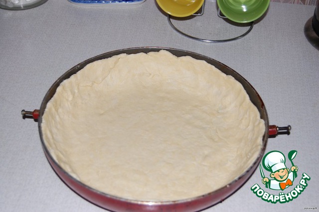 Замесить тесто, раскатать, положить в форму, оставляя высокие бортики. Наколоть вилкой, чтобы не поднималось. Выпекать 10 минут при 220 градусах.