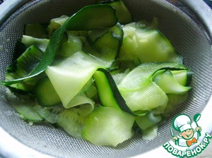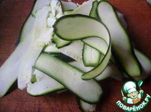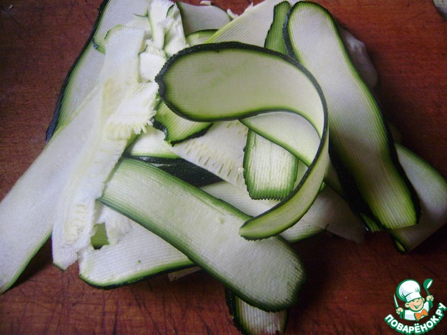Цуккини нарезаем тонкими слайсами при помощи овощечистки.