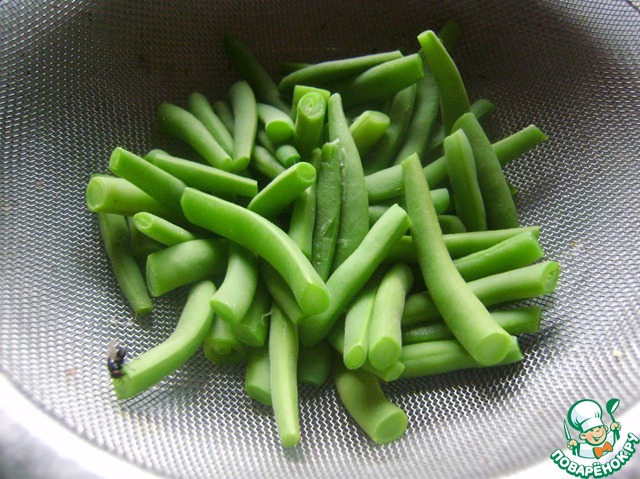 Фасоль отвариваем в подсоленной воде 5 минут. Откидываем на сито и даем остыть.