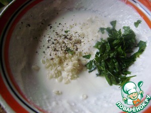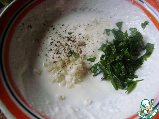 Делаем заправку. Чеснок и мяту мелко порубить. Добавляем в йогурт, солим и перчим по вкусу.