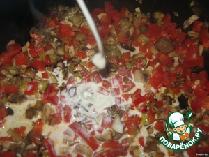 Лук порей нарезать,спассеровать на сливочном масле,добавить к нему нарезанные грибы,перец.Все обжарить,залить сливками ,посолить и тушить до испарения сливок.