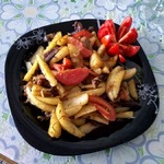 Помидор нарезать так же дольками, отправить в сковороду, перемешать и на сильном огне готовить 1 минуту.