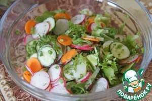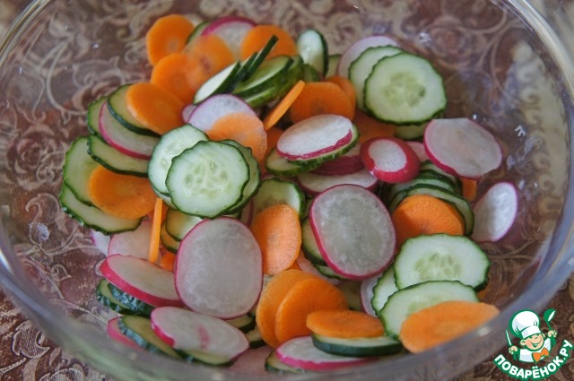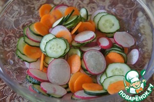Нарезать очень тонкими кружочками редис, морковь и огурцы.