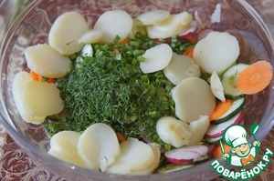 Всыпать в миску с овощами. Добавить кружочки картофеля. -